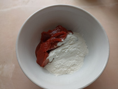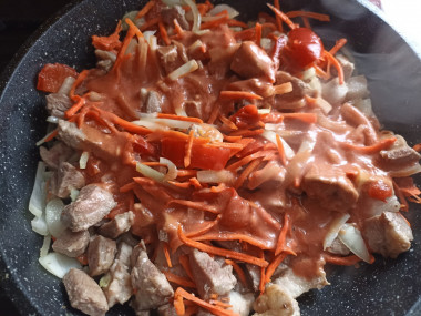 В оставшихся 100 мл воды разведите томатную пасту и муку. Влейте эту смесь в сковороду и перемешайте. Соус посолите, поперчите и тушите еще около 10 минут. Мясо должно стать мягким.