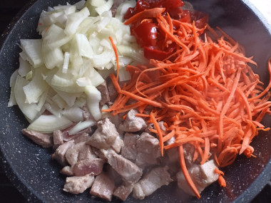 Влейте 100 мл воды и тушите мясо с овощами около 10 минут.