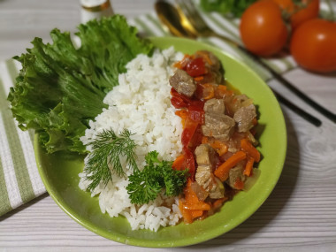 Гуляш с рисом приготовила по этому рецепту, использовала свежее мясо свинины и рис басмати. При варке риса добавила больше воды (1:2, но это на любителя, я не люблю слишком сухой), после выкипания воды рис доходил под крышкой и стал рассыпчатым и вкусным, как и указано в рецепте. Мясо до мягкости пришлось тушить долго (минут 25-30), приходилось постоянно подливать понемногу воды, морковь и болгарский перец при этом сильно разварились, подливка приобрела насыщенный овощной вкус. Томатную пасту добавила в самом конце, муку вводила через маленькое ситечко для чая прямо на сковороду, чтобы не образовывались комочки. После этого тушила, постоянно помешивая, около 5 минут. В итоге получился аппетитный и сытный ужин - гуляш с рисом.
