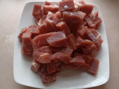 Свинину вымойте, обсушите и нарежьте средними кубиками. Какое мясо можно брать помимо свинины? Любое. Подойдет говядина, курица или индейка. Но при этом учитывайте, что изменится калорийность и время приготовления блюда.
