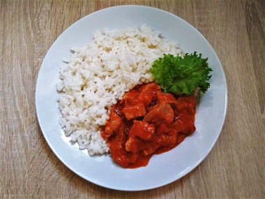 Гуляш из свинины разложите по тарелкам и подайте к столу с рисом. Приятного аппетита!