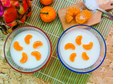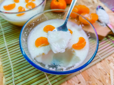 Готовится десерт очень просто. Желатин у меня не быстрорастворимый, поэтому залила его водой на 30 минут. Молоко взяла жирностью 3,5 процента. От себя ещё добавила кокосовую стружку. Примерно через 3 часа желе было готово.