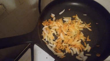 Приготовьте зажарку для супа. Как сделать зажарку? На сковороду налейте растительное масло. Поставьте ее на огонь. Выложите на сковороду тертую морковь и измельченный репчатый лук. Обжарьте овощи на среднем огне, периодически перемешивая лопаткой, до мягкости моркови и прозрачности репчатого лука.