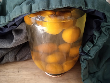 Сделала абрикосовый компот из абрикосов на 3 литровую банку на зиму по этому рецепту. Очень быстрый способ заготовить абрикосы прямо с косточками на зиму. Абрикосы рвала прям с дерева, хорошие и спелые, но не мягкие, чтоб не лопнули в банке, а остались целенькими. Чистые абрикосы с косточками уложила в 3-х литровые банки на глаз. Залила кипятком и оставила настаиваться на 20 минут по описанию в рецепте. Специальной крышкой с дырочками накрыла банки, слила воду с ароматом абрикос и добавила сахар. Положила сахара немного меньше, чем указано в рецепте, так как абрикосы у меня очень сладкие. Закипятила сироп, залила в банки и закатала. Всё очень просто и быстро. В одну банку положила ещё веточку мяты для эксперимента, зимой попробую) Компот очень вкусный из абрикос, насыщенный и полезный. Зимой напиток принесет и взрослым, и деткам много витаминов) а ещё можно скушать целые абрикоски) Компот и вправду вышел солнечный))) Автору большое спасибо!