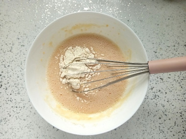 Введите в будущий крем пшеничную муку. Тщательно перемешайте смесь венчиком, чтобы не было комочков.