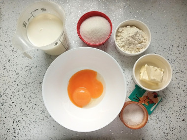 Калорийность продуктов: Молоко, Яичные желтки, Сахар, Сливочное масло, Пшеничная мука, Ванильный сахар, Соль