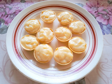 Решила побаловать детишек и приготовить десерт. Для этого мне понадобился простой рецепт вкусного крема. Ванильный крем заварной как раз пришелся кстати. Готовить абсолютно просто и довольно таки быстро. Сперва наперво нагрела молоко, но не кипятила по совету автора. Отдельно венчиком смешала желтки с сахарным песком и ванильным сахаром. Ввела муку, получилась густая масса. Затем частями вливала горячее молоко, помешивая. На плите постоянно мешала. Лучше далеко не отходить, масса густеет на глазах. И всегда мешать, чтоб не пригорел крем. Готовый ванильный крем заварной перелила в мисочку и прикрыла пакетиком, чтоб не было грубой корочки. Остывший крем вышел ароматный и густой. С таким кремом работать очень легко. Можно и торт намазать) я же наполнила кремом мини тарталетки. Очень вкусно получилось. Детки поменьше просто вылизывали ванильный крем из тарталеток)))) детки побольше ели десерт целиком. Отличный рецепт! Просто и быстро из доступных продуктов. Большое спасибо автору!