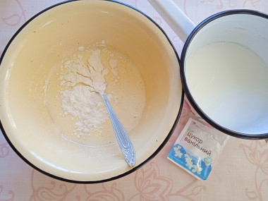 Молоко влейте в сотейник или небольшой ковшик. Поставьте молоко на плиту на медленный огонь без крышки. Кипятить молоко не нужно, поэтому, как только появятся первые пузырьки, снимите его с огня. В процессе нагревания присматривайте за молоком, так как оно может убежать. Возьмите миску, всыпьте в нее сахар, ванильный сахар, добавьте желтки. С помощью венчика разотрите сахар с желтками.