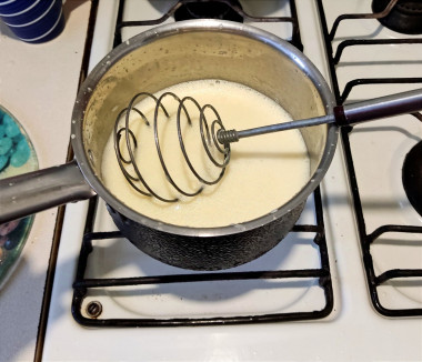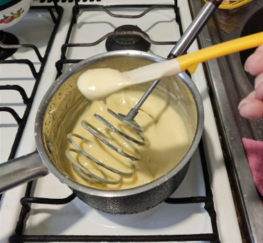 - Дайте загустеть основе крема при варке (мука должна завариться, но следите, чтобы будущий крем не пригорел и не было комков).
