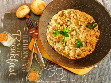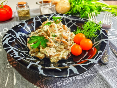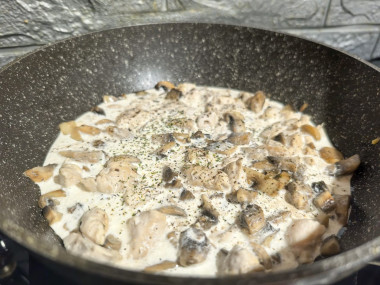 Быстренько нарезала грибы и курицу . Поджарила до румяности грибочки . Масло для жарки взяла чесночное 🧄. Следом отправила курицу . Готовила всё вместе минут 15-20 . Когда филе побелело, влила сливки, добавила специи ( соль , молотый перец чёрный , смесь трав ) , и томила , на среднем огне еще минут 10. За пару минут до выключения добавила измельченный укроп .
