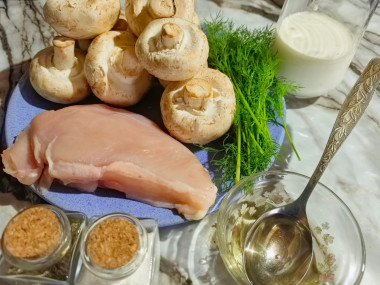 Как сделать курицу со сливками и грибами на сковороде? Подготовьте продукты. Для этого рецепта можно использовать как филе курицы, так и любые части птицы, с косточками и без. Вместо шампиньонов подойдут любые другие грибы. Сливки для соуса лучше использовать 20%, 10% слишком жидкие, 33% — жирные. Зелень подойдет любая.