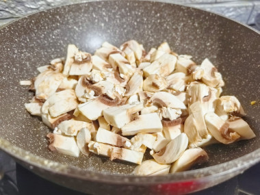 Разогрейте на среднем огне сковороду, налейте на нее растительное масло для жарки. Выложите грибы. Жарьте их до легкого зарумянивания, время от времени перемешивая, около 5 минут.
