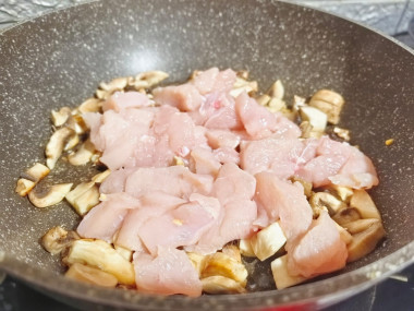 Затем выложите к грибам кусочки курицы. Огонь сделайте сильнее. Активно перемешивая мясо, дождитесь его полного побеления со всех сторон. Такой способ обжарки запечатает сок внутри, что сделает мясо сочнее. Жарьте курицу 5-10 минут, в зависимости от размера кусочков (крупные куски с костями жарьте дольше). Посолите и поперчите мясо, перемешайте.