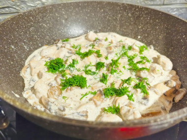 Влейте в сковороду сливки, огонь сделайте небольшим. Тушите блюдо при слабом кипении около 5 минут. Густоту соуса регулируйте количеством сливок, их может потребоваться больше или меньше. В конце добавьте мелко нарезанную зелень.