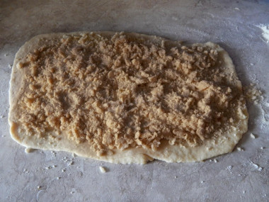 Тесто раскатайте на присыпанном мукой столе в ровный прямоугольный пласт 40×30 см и толщиной около 5 мм. Поверхность теста смажьте растопленным сливочным маслом. Поверх распределите измельченные грецкие орехи с сахаром, не доходя до краев 1-1,5 см.