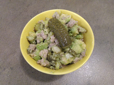 Прежде всего подготовьте все необходимые ингредиенты. Авокадо выберите спелый, но не очень мягкий, иначе в салате он может превратиться в кашу. Солёные огурцы смело можно заменить на маринованные, вкус готового салата немного заиграет новыми нотками и хуже ничуть не станет. Вместо лимона я использовала сок свежевыжатого лайма, а оливковое масло взяла с добавлением свежего базилика.