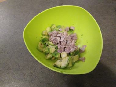 С печени трески слейте масло, нарежьте кусочками примерно такими же, как авокадо. В любом случае форму и размер нарезки вы можете выбрать по своему вкусу. Добавьте печень трески в салатницу. По желанию можно использовать ещё куриную печень.