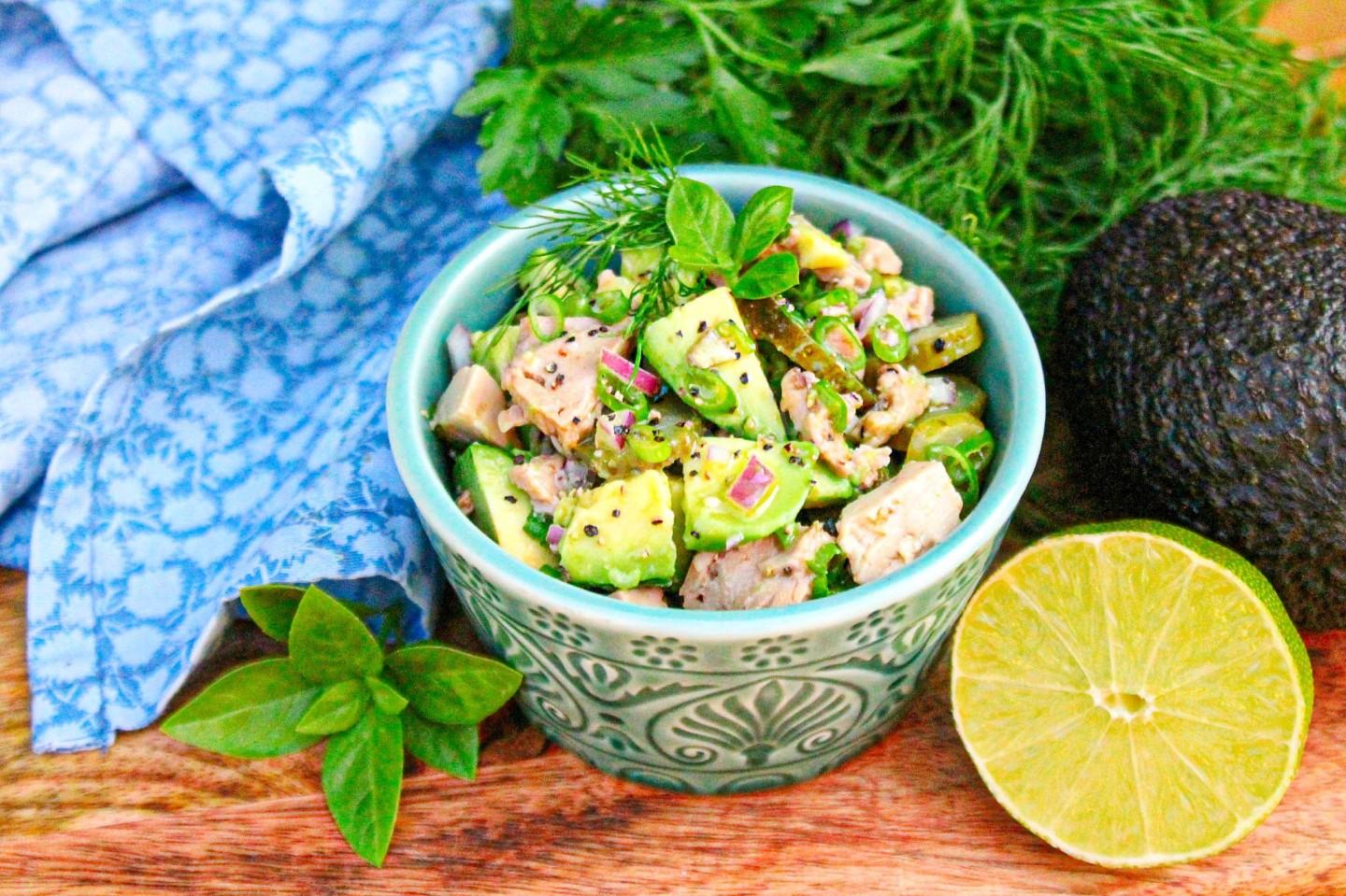 Варианты подачи салата: в салатнице, украшенный дольками авокадо и веточкой укропа; в виде намазки на крекеры, бутерброд или брускетту; в порционных тарталетках или ложках для фуршета; на листьях салата айсберг или романо. Салат храните в герметичной сухой таре в холодильнике не более 12 часов. Авокадо может немного потемнеть, поэтому лучше съесть блюдо сразу. Приятного вам аппетита!