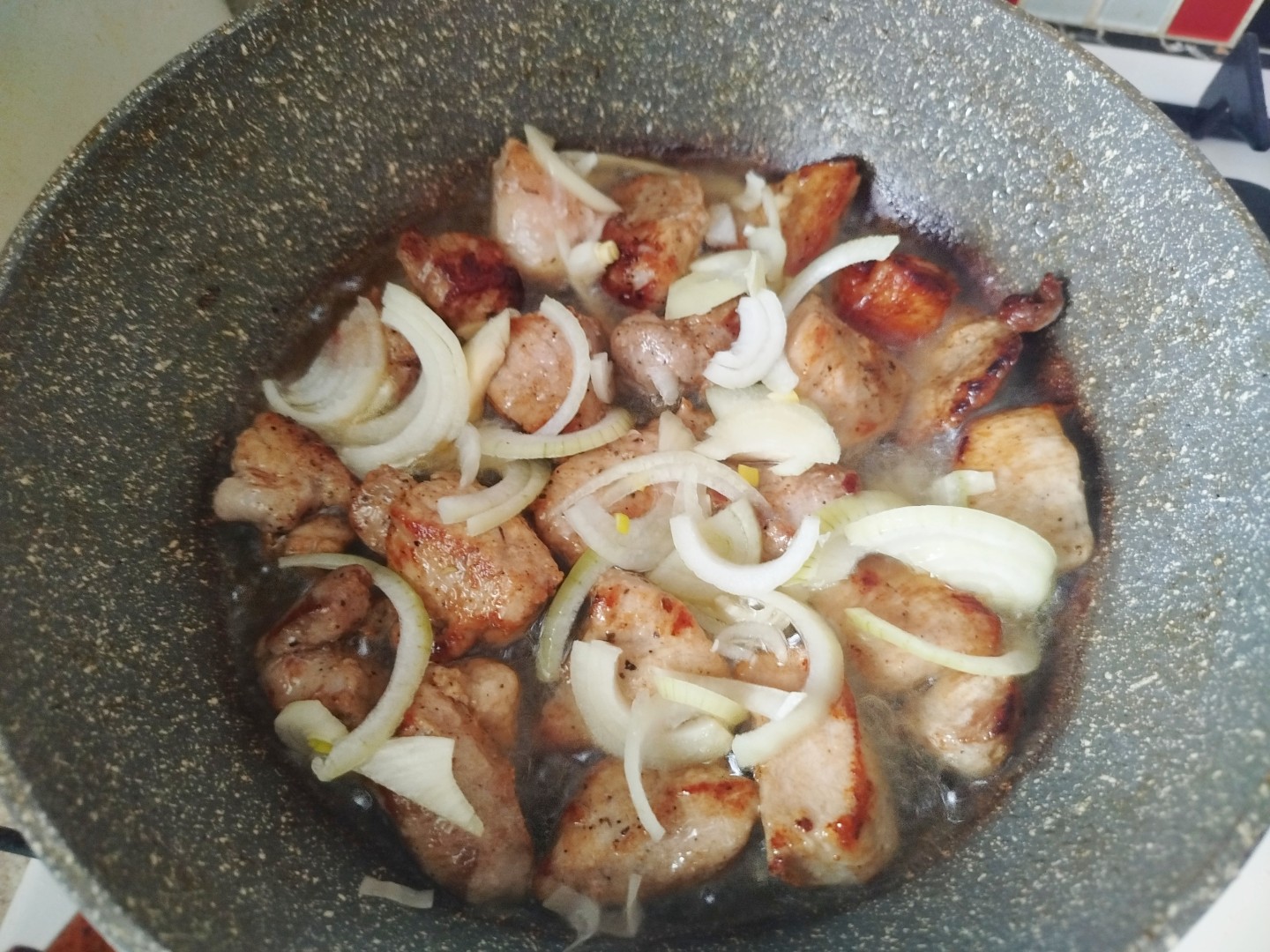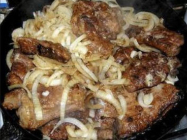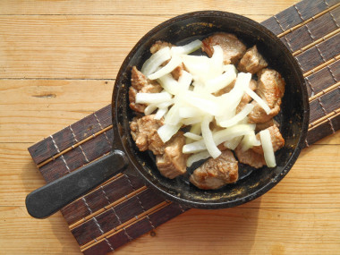 Обжарьте мясо до румяной корочки с одной стороны, затем переверните на другую. Когда мясо зарумянится с обеих сторон, добавьте в сковороду лук. Жарьте мясо с луком, помешивая, еще несколько минут.
