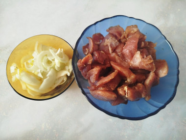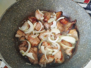 Свинину я нарезала небольшими кусочками,добавила специи и оставила на полчасика помариноваться. Нарезала лук полукольцами. Разогрела сковороду и выложила на нее мясо одним слоем,обжарила с обеих сторон до румяности,потом уменьшила огонь,положила лук к мясу и жарила до готовности.