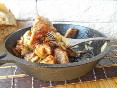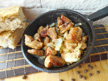 Жареное мясо на скороде получилось сочным, мягким и ароматным. Я взяла кусок свинины, помыла, обсушила и нарезала небольшими кусочками. Сложила в миску, посолила, добавила чёрный молотый перец и растительное масло. Оставила на 15 минут, за это время мясо немного промариновалось и дало сок. Сковороду сильно нагрела и выложила мясо, хорошо зажарила со всех сторон. Огонь уменьшила и добавила лук, жарила пока лук не стал прозрачным. Мясо остается сочным, приобретая румяную корочку. Жареное мясо подходит к любому гарниру, да и просто с кусочком свежего хлеба! Особенно вкусно в горячем виде.