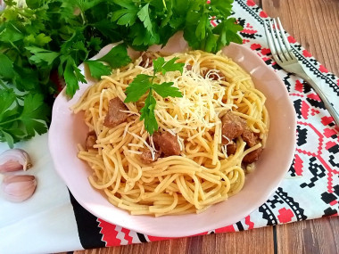 В это время отварила до готовности спагетти, для удобства разломила их на 4 части. Осталось только смешать макароны с зажаркой и прогреть.