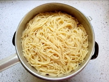 В кастрюлю налейте воду, добавьте щепотку соли и доведите ее до кипения. Опустите в кипящую воду макароны, перемешайте, доведите до кипения, убавьте огонь и варите в течение времени, указанного в инструкции на упаковке. Макароны оставьте немного недоваренными. Воду слейте, макароны откиньте на дуршлаг, дайте воде стечь.