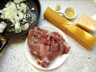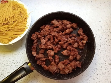 Перемешайте и жарьте мясо на среднем огне, периодически перемешивая лопаткой, около 15 минут. Параллельно поставьте отвариваться макароны. Макаронные изделия для этого блюда можно использовать абсолютно любые по вкусу и наличию, у меня спагетти. Полезнее, конечно, продукт из твердых сортов пшеницы. Как выбрать макароны читайте в статье в конце рецепта.