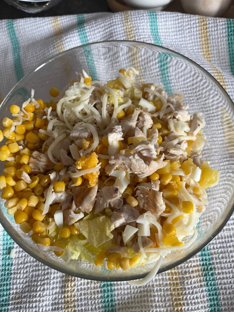 В салатник выложить куриное мясо, пекинскую капусту, вареные яйца, ананасы, кукурузу, зелень.Шаг 8: