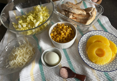 Как сделать салат с пекинской капустой ананасами и курицей? Подготовить ингредиенты. Нам понадобится: отварное куриное филе или куриная грудка, яйца, консервированные ананасы, несколько листиков пекинской капусты, консервированная кукуруза, петрушка, майонез и черный молотый перец.Шаг 2: