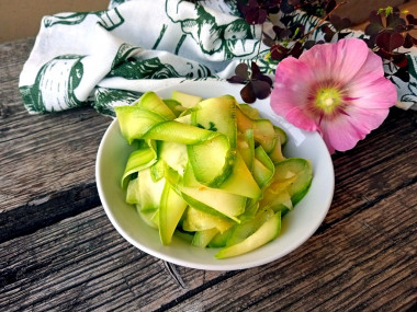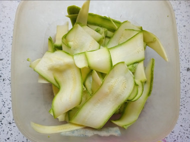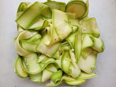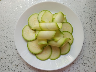 Кабачок помойте, обсушите, отрежьте кончики. Нарежьте его овощечисткой на тонкие слайсы. Как вариант, можете просто нарезать кабачок ножом на тонкие кружочки.