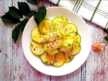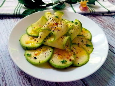 Маринованные слайсы из кабачков - это прекрасное дополнение к блюдам из картошки на ужин. Так считает мой муж и я с ним согласна. Тем более, что блюдо это можно приготовить за считаные минуты. Дольше всего нарезать кабачок слайсами, я это делала при помощи овощечистки, очень удобно. Заправку сделала на основе нерафинированного горчичного масла, оно нам нравится за вкусный аромат. Вместо винного уксуса яблочный, остальное все по рецепту. Кабачки полила соусом, сверху посыпала смесью душистых перцев из мельнички. Блюдо настаивалось 15 минут. Кабачки на вкус пряные, чуть островатые, приятно хрустят. Нам закуска понравилась. В качестве закуски на скорую руку очень даже отлично!