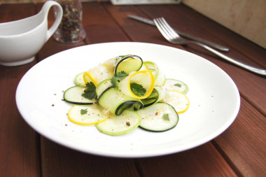 Выложите слайсы кабачков на тарелку, украсьте зеленью и подавайте к столу. Приятного аппетита!
