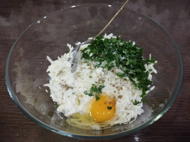 Творог размяла вилкой, добавила натёртый сыр, яйцо, соль, специи, муку и хорошо перемешала.