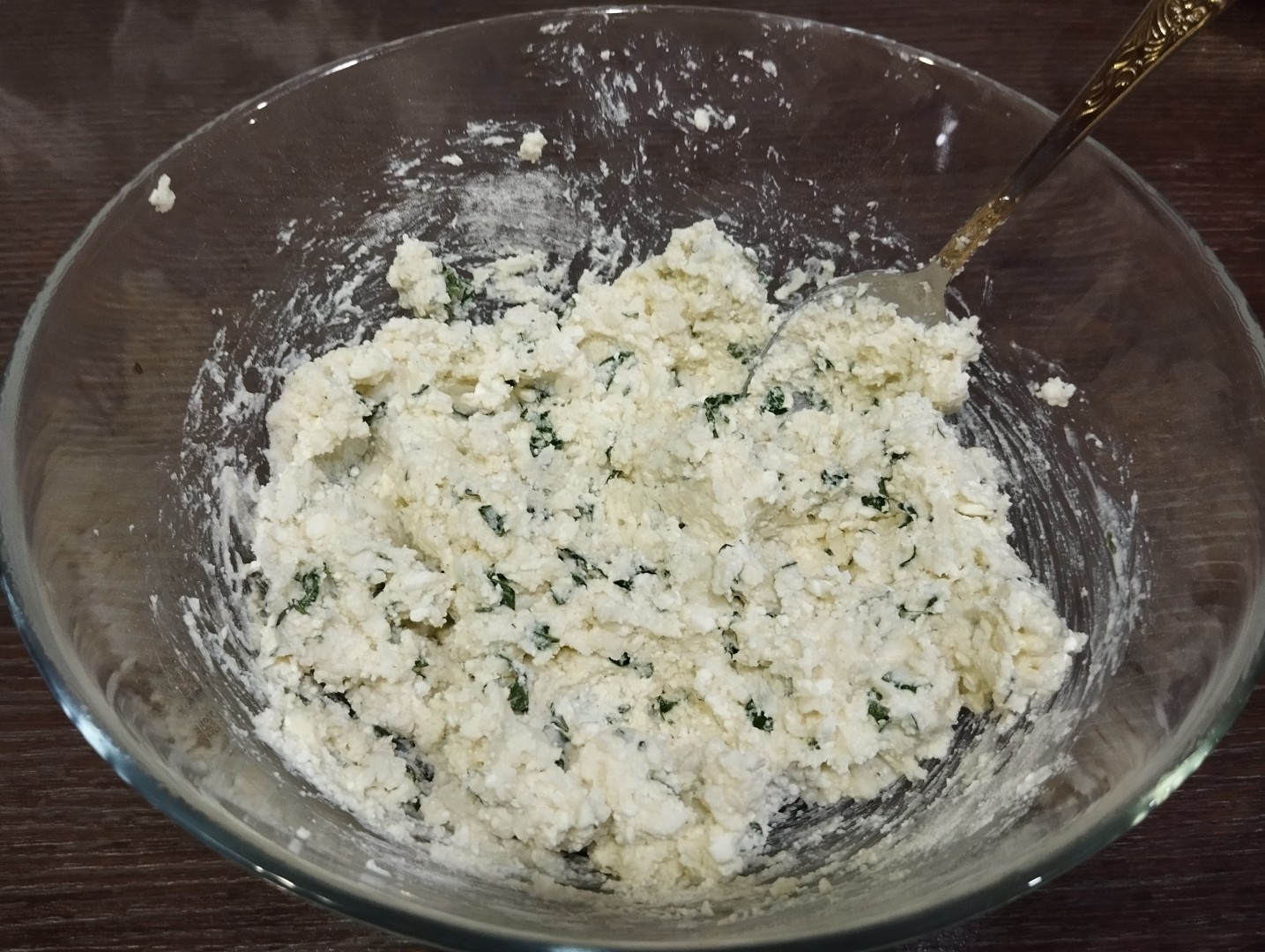Творог переложите в глубокую миску. При желании можете протереть творог через сито или пробить его блендером. Зелень промойте, обсушите и мелко нарежьте ножом. Натрите сыр на крупной терке. Переложите сыр и зелень к творогу. Добавьте муку. У меня ушло 2 ст. л. без горки. Но лучше ориентироваться на свой творог. Возможно, вам понадобится меньше или больше. Смешайте все ингредиенты до однородности.