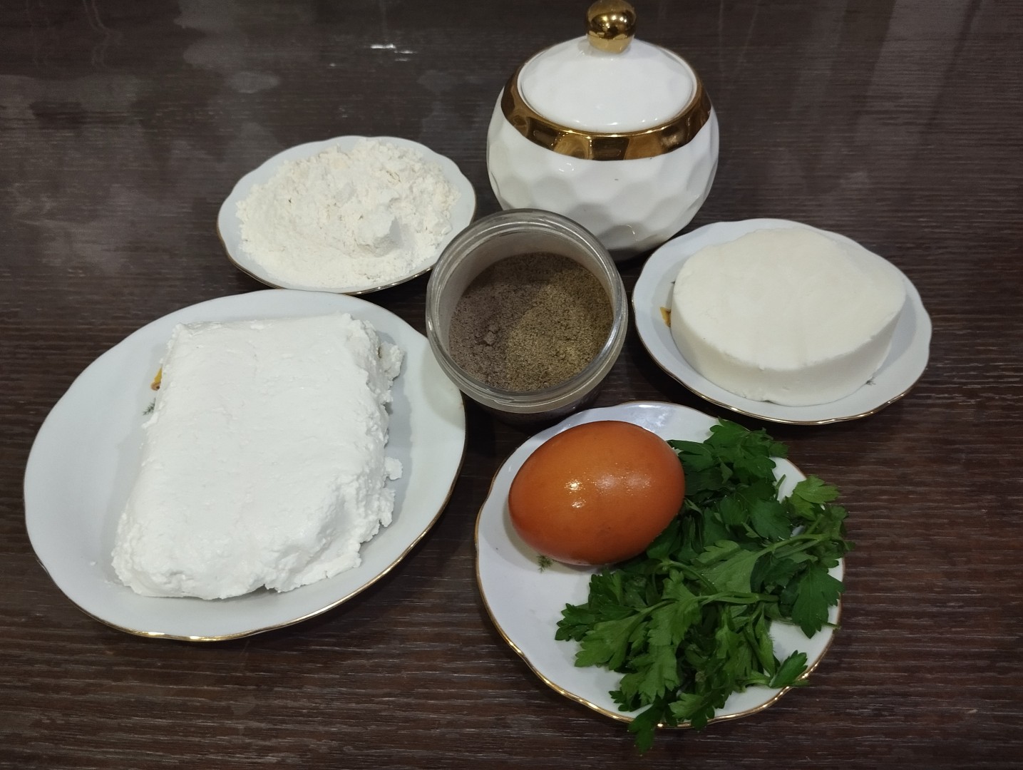 Творог у меня был в брикетах, сыр брала моцареллу, из зелени петрушку.