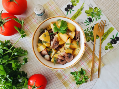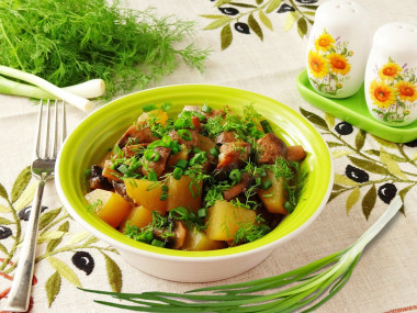 Разложите тушеную с грибами картошку по тарелкам, посыпьте свежей зеленью по вкусу и подавайте к столу. Приятного аппетита!