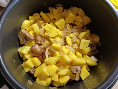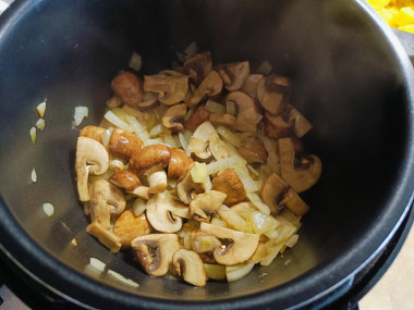 К обжаренному луку добавьте грибы. Посолите и поперчите их. Также с открытой крышкой жарьте шампиньоны, помешивая, до испарения влаги. Как раз к этому моменту и закончится программа.