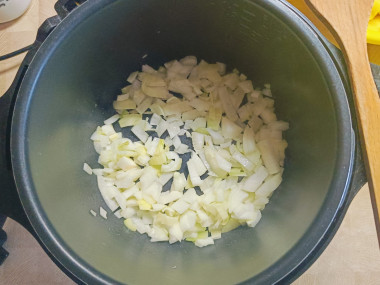 Включите на мультиварке режим, подходящий для жарки. Он может называться по разному, в зависимости от модели. Время (если оно выставляется) поставьте 20 минут. Немного прогрейте прибор, затем влейте в чашу растительное масло без запаха. Выложите лук. Обжарьте его, помешивая, 5-7 минут, до золотистости. Крышку закрывать не нужно.