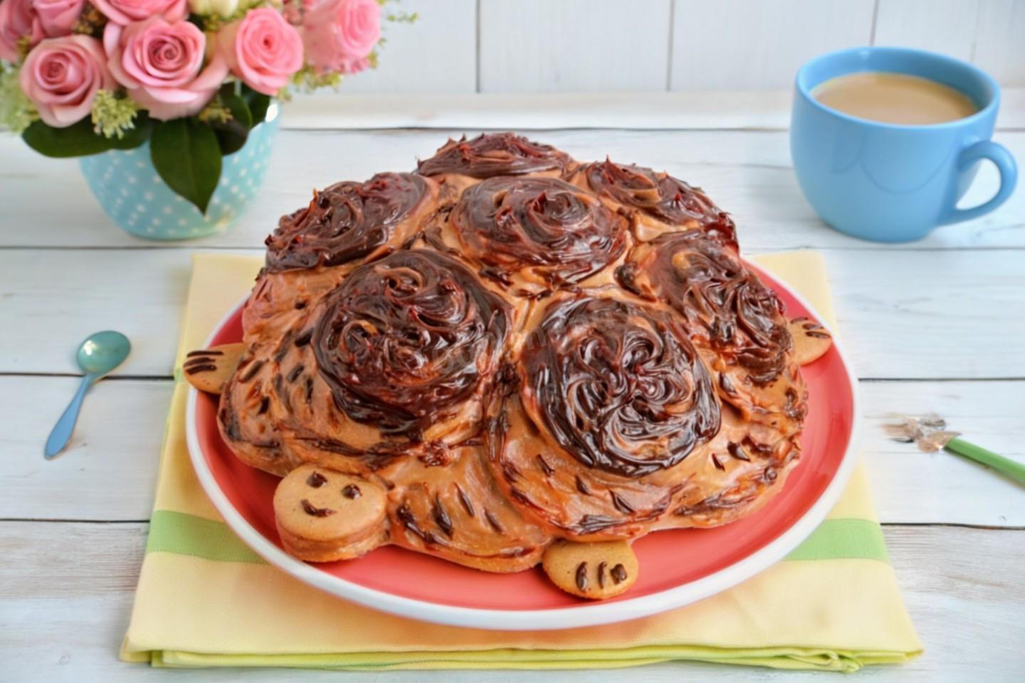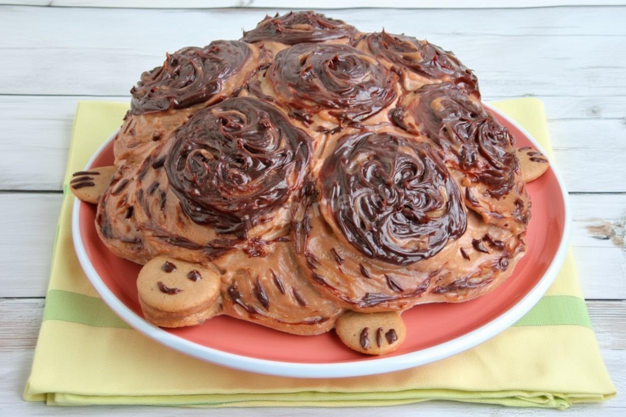 Украсьте глазурью верх панциря, на голове нарисуйте глазки, рот, на лапках коготки. Глазурь можно держать на едва тёплой плите, так с ней будет легче работать. Оставьте торт на столе на полчаса, затем уберите для дальнейшей пропитки в холодильник. Через пару часов торт можно подавать к столу. Приятного чаепития!