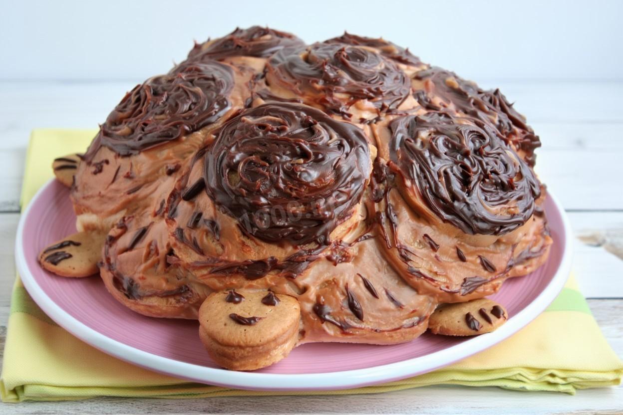 Верх панциря сформируйте из мелких, по возможности одинаковых лепёшек. Смажьте кремом нижнюю часть лапок, хвост и прикрепите их к блюду, чуть подталкивая под панцирь в положенных местах. Две маленькие лепёшки для головы полностью окуните в крем и прикрепите в центре. У третьего маленького круга смажьте только низ и прикрепите на две нижние лепёшки. Голова готова. Остатки крема равномерно распределите по всему торту. Оставьте торт на столе для пропитки.