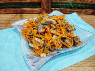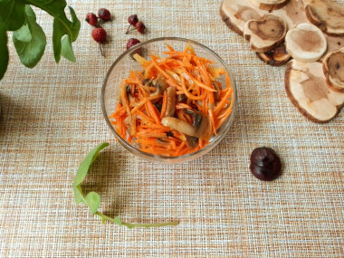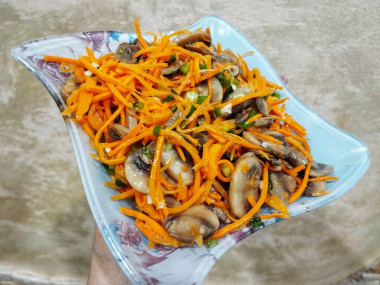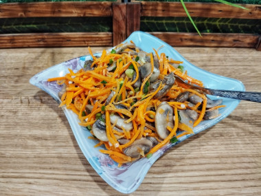 Спустя указанное время можно подавать салат с жареными шампиньонами и корейской морковью к столу. Приятного аппетита!