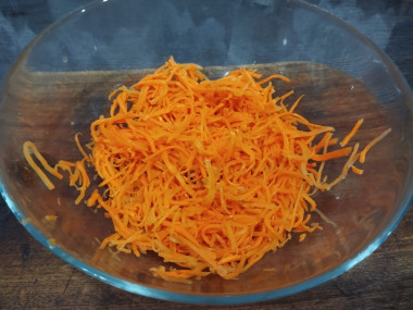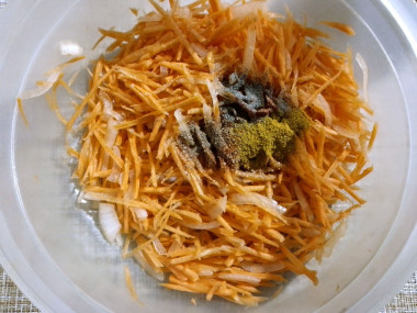 Готовой корейской морковки у меня не было, поэтому приготовила ее сама. Готовой смеси для этого у меня не было. Из специй я добавила размолотые ядрышки кориандра, черный молотый перец, смесь перцев, карри и паприку.
