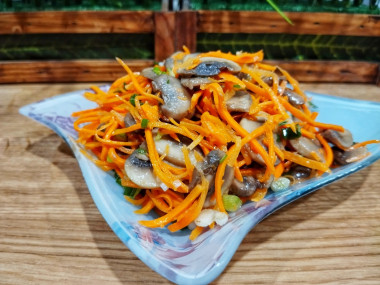 Салат с шампиньонами и корейской морковкой привлёк своей простотой.