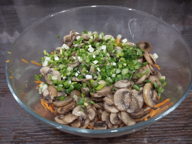 Добавьте к моркови жаренные шампиньоны с луком и петрушку. Перемешайте все содержимое. Поместите салат в холодильник для пропитывания примерно на 1 час.