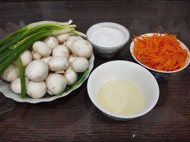 Как приготовить салат с грибами шампиньонами и корейской морковью? Для начала подготовьте продукты по списку. Морковь выбирайте упругую и хрустящую. Лук и чеснок почистите. Зелень помойте и просушите с помощью бумажных полотенец.