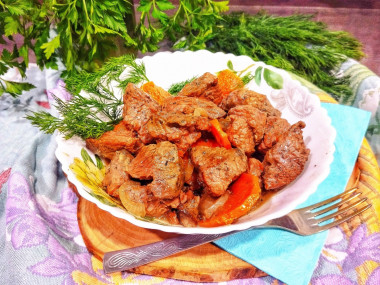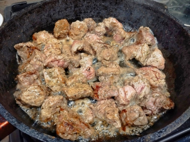 Мясо нарезала средними кусочками, замариновала в специях. Оставила на 2 часа. Затем обжарила на сильном огне до слегка румяной корочки.