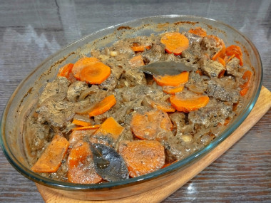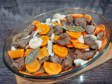 Выложила мясо в форму для запекания, добавила морковь, порезанную колечками и лук, порезанный полукольцами. Добавила воды. Форму накрыла фольгой и убрала в духовку томиться при 150° на 2 часа.