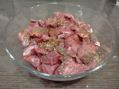 Выложите мясо в миску. Посыпьте паприкой, молотым кориандром, сушеными травами, солью и перцем. Влейте лимонный сок.