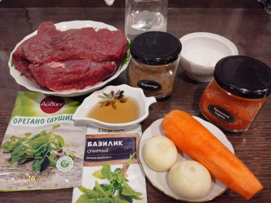 Как сделать томленое мясо говядины в духовке? Очень просто! Для начала подготовьте необходимые ингредиенты по списку. Чтобы мясо получилось сочнее, лучше использовать мякоть свежей говядины или телятины. Растительное масло берите любое. У меня подсолнечное. Овощную часть можете дополнять или заменять по своему вкусу.